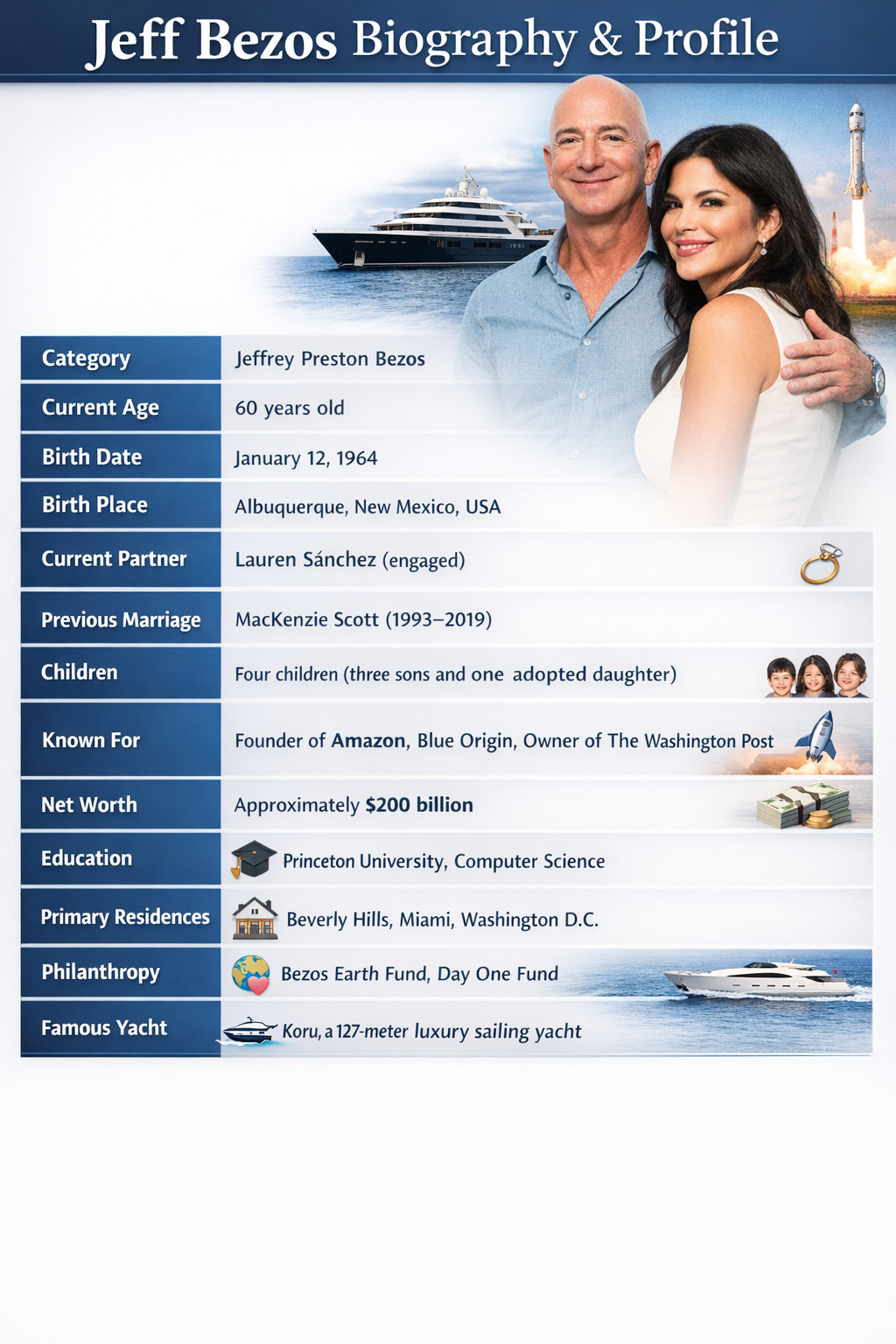 Yet when people search who is Jeff Bezos, they’re often trying to understand the man behind the innovation. Today, at age 60, Bezos focuses not only on business ventures like Blue Origin but also on family, relationships, and long-term impact.